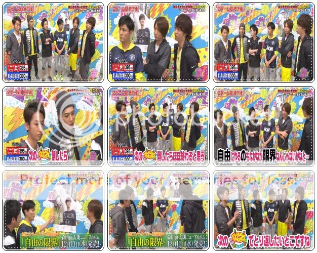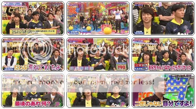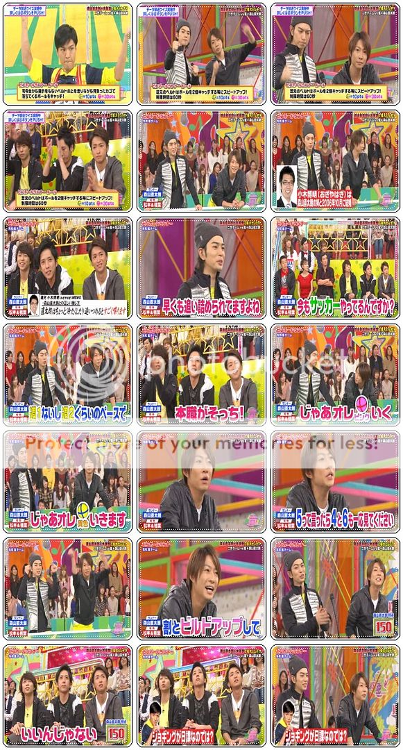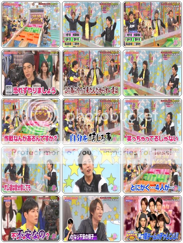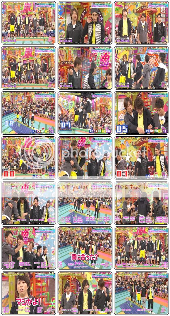 今天的10秒挑戰是讓門把在那個單槓上以年齡順序從左到右排列出來。啊啊啊!!好有趣!首先,讓年紀最小的潤先以大家幫忙越過去到最右邊。然後三位年上哥哥就開始掙扎了。先是讓利達越過翔和雅紀到最左邊。大家都抱在一起了!!!!你們說是不是萌點!!!其實利達越過去後時間就到了,可是翔和雅紀堅持完成。兩個人互相對換位置還是抱在一起了!!!!!啊啊啊!!我的櫻葉抱一起了!!哈哈!