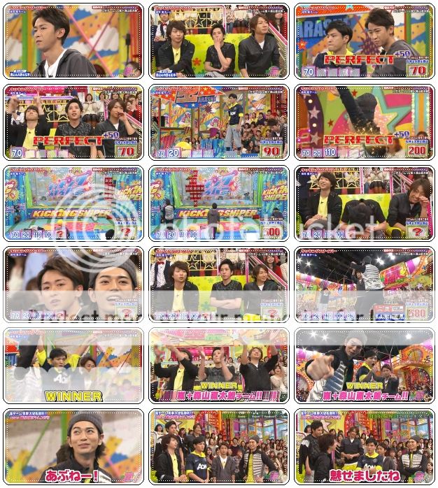 雅紀也被那個煙嚇到表情也好可愛!阿翔看前面兩顆如此,加上第三顆橘色區的兩位沒能把球順利運送到分數格子裡,他覺得牙白了牙白!為何我每次看這個遊戲我就特別興奮特別緊張特別喜歡說牙白呢!哈哈