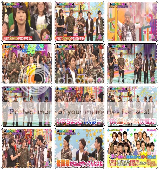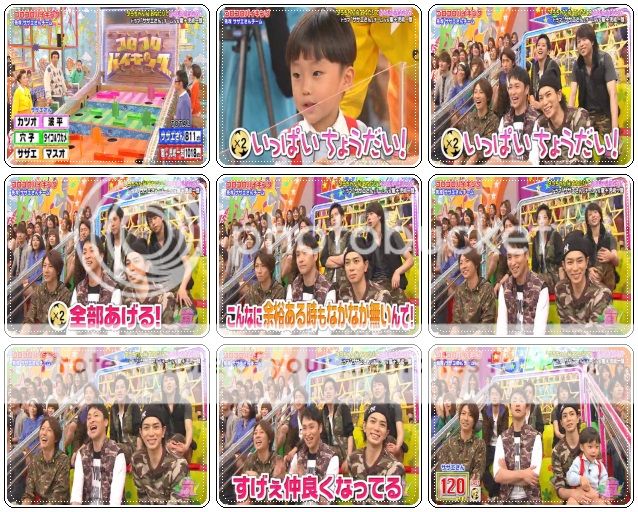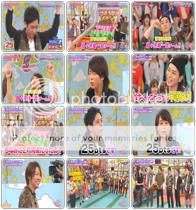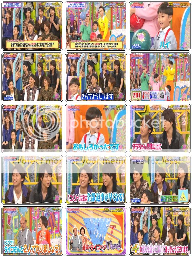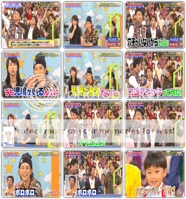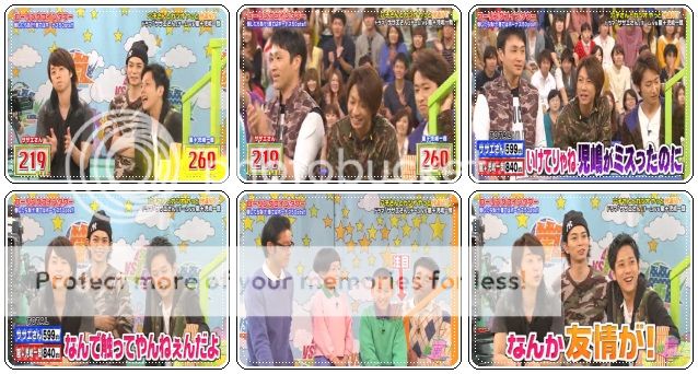 開始對方隊好厲害,派出了遙斗醬來向嵐哥哥們求情了。因為現在分數落後了,所以希望嵐隊的哥哥們把金色球都給他們。於是我們翔好酷的一口就答應了!哇哈哈哈!!翔,你大概沒料到輪到你們時,你是負責橘色區吧?嘻嘻