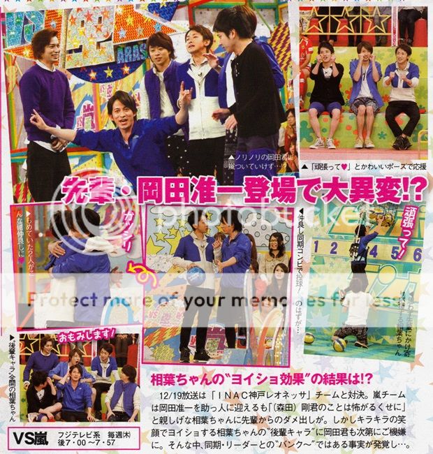 OMG!!!最近真的有感覺J家無論是前輩還是後輩團都和嵐有密切接觸呢。大家是想和TOKIO大哥們一樣嗎?和前/後輩打好關係嗎?上週是Hey!Say!JUMP的知念君來,12月19日的番組就換我們V6的岡田君來了!之前不是帶劇組隊來VS嵐嗎?現在換他當PLUS ONE了!V6門把來過VS嵐的暫時有利達坂本桑、岡田君、健醬和剛君。不記得有看過其他兩位門把。應該沒有吧?如果有請麻煩通知我一下是哪一期的,我要去複習。哈哈!