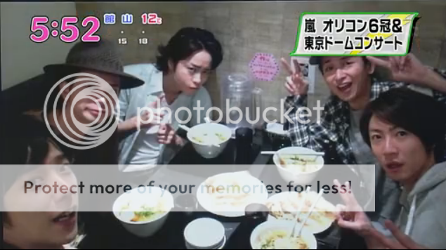 話說朝日台,你們贏了!!!!竟然放了他們在控MC時放的相片。這是他們排練之後一起去吃拉麵了!!!啊啊啊~~~這樣五人一起去吃東西的畫面太值得珍藏了!!話說原本會很擔心如果五人一起出去吃飯會造成店家的困擾和引起騷動,可是。。。現在很多人在東京看到嵐五人一起出來吃飯的反應是『啊!是嵐。』然後就很冷靜的走開了。要是我就不能想像我會有什麼反應了。可能會驚訝到不懂得反應?嘻嘻。