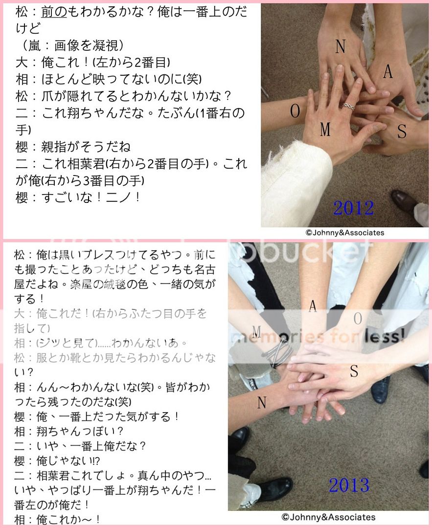 NINO然後指出雅紀的手『愛拔君的手是中間那個喲。啊不!最上面的手確實是翔醬的。我的是左邊第一個。』