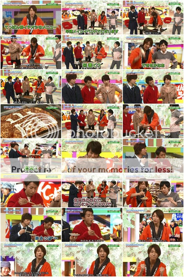 讓門把來試試看雅紀製作的大阪燒。雅紀翻面大成功!!然後問門把要在大阪燒上面寫什麼?然後雅紀竟然寫上了他這輩子最愛的字樣(也是我這輩子最愛的字):嵐!好看啊!!不過NINO就吐槽雅紀說現在寫上這個字樣要怎麼切呢?哈哈哈!!說的也是啊!!嵐不能切下去的呀。說真的,阿翔很給面子嘛,吃的是津津有味啊。(不過我們阿翔到底有什麼不喜歡吃的?哈哈哈。)然後潤和利達也是吃的很香的樣子。利達還不知道在說什麼(大概是在稱讚說好吃)可是因為滿嘴大阪燒口齒不清了。哈哈哈!潤直接『誒?』然後阿翔也吐槽了利達。