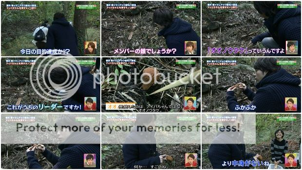 吃飽飯,繼續尋找“愛拔醬”任務!阿翔看到一個蘑菇,問部隊『這不是“愛拔醬”吧?那請問這是我的門把哪位?NINOMIYA?』喂喂,你出外景也一直嚷嚷著你的小情人(噗!)還有磁石是怎樣!部隊的成員說這是大野蘑菇。『啊!所以這是我們家利達啊?(BGM竟然播放利達的solo歌。噴笑死了!)這時候一定要看攝影棚的那個小窗口因為提及門把時都會特意特寫門把。大野蘑菇竟然是軟綿綿的,不過裡面是空心的。』(軟綿綿的真的很像我們利達!噗!!阿翔的表情好奇妙。)