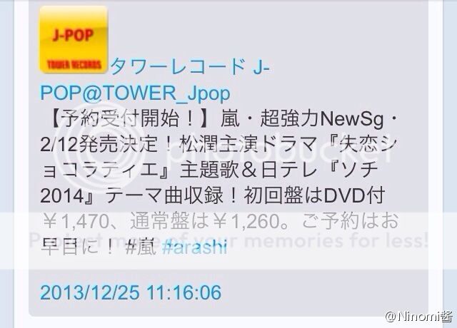 我們嵐明年第一張SINGLE將在2014年2月12日發售了!!結成15週年的第一張啊!!!恭喜!!