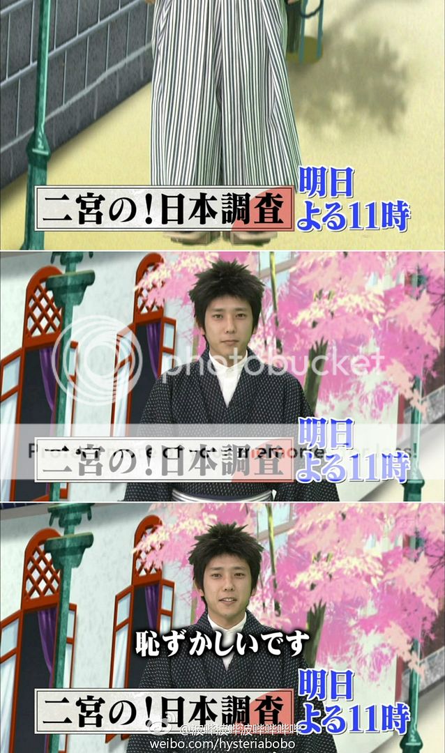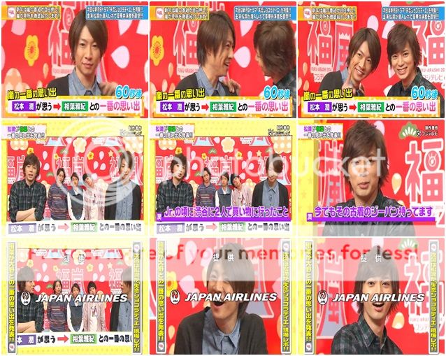 今晚是潤對雅紀的深刻回憶。一提到雅紀的名字,潤忽然抓過雅紀的肩膀對他深情對看啊!!!我的天啊!!雅紀你怎麼沒臉紅呢?(還是因為背景太紅所以看不到?)話說,潤這麼看雅紀,後頭某個人一直喔~~~~~的叫。好吧,看來你是希望是你說你家的老婆啦,不過是不大可能了。就希望明天是雅紀對你的深刻印象吧。不過我猜也是不大可能了。我覺得很有期望明天雅紀會對利達深刻回憶。不過潤對雅紀深刻回憶,NINO你是有多累啊,直接都想靠上利達的肩膀了啦。還有。。。某人悔恨的眼神。(自己胡思亂想。嘻嘻)