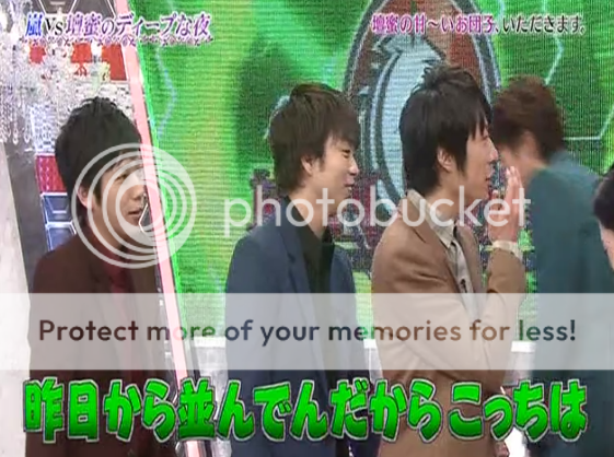 於是雅紀、翔和NINO就很乖的立刻排好隊。潤和智本來還想直接插隊,被雅紀說『我們從昨天就開始排隊了,你們到後面去排隊。』噗!!!笑死我了!!最好笑的是利達和潤還真的跑到後面去排隊了。哇哈哈!!