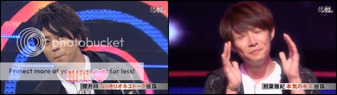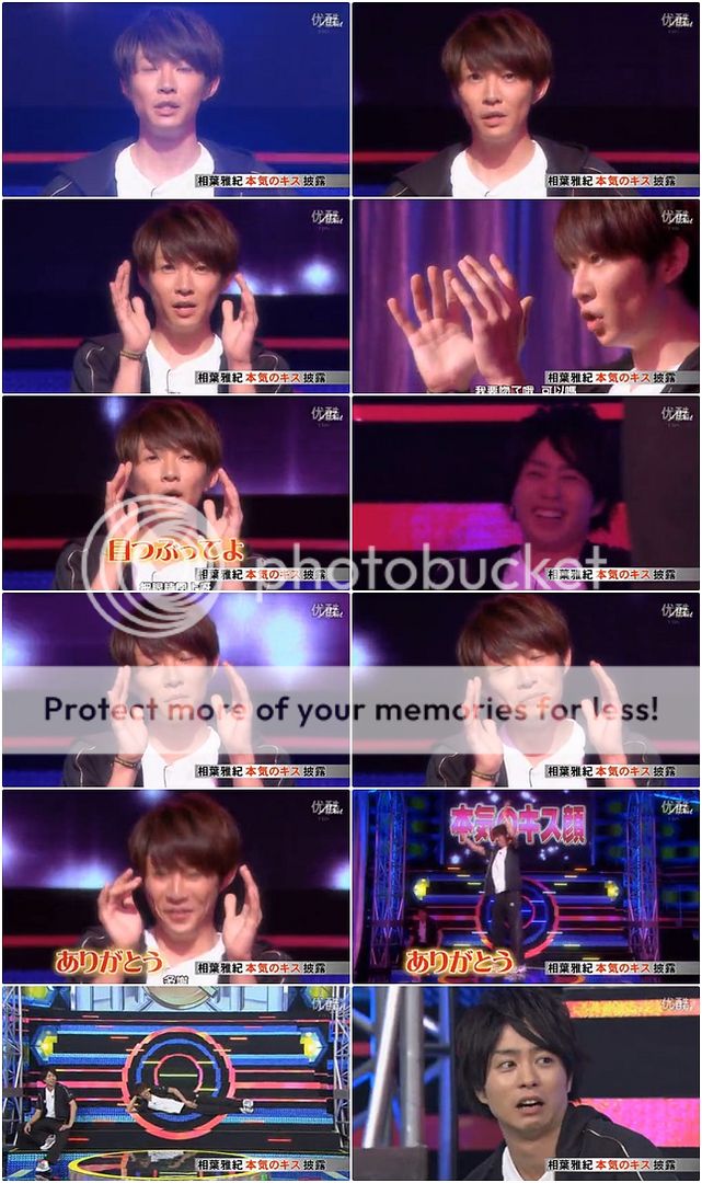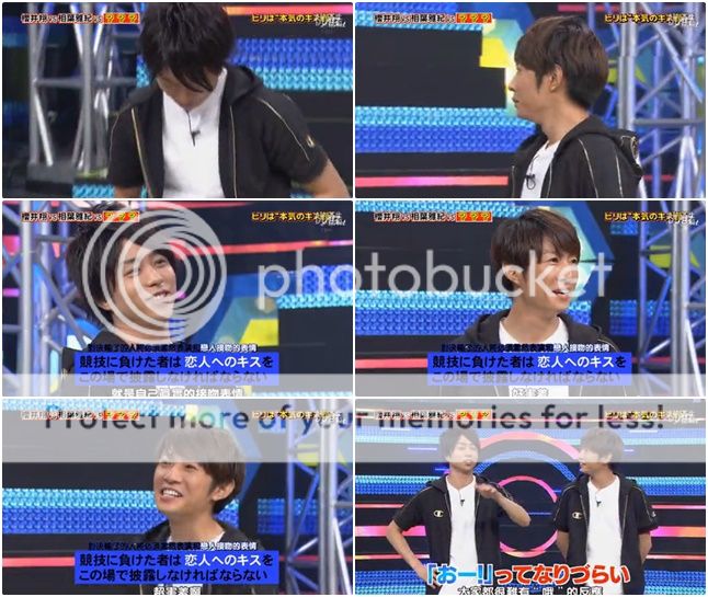 這個單元最讓人期待的……當然就是嵐其中一名門把失敗咯,那就可以看到他們的幻想和戀人KISS畫面了!!!阿翔一看到出現的第一個懲罰就直接跪地了,但雅紀沒搞懂啊。第一次來嘛。MC介紹了之後,雅紀恍然大悟。超級丟臉的啦!!!其實我好想看雅紀對空氣幻想KISS呀~~~嘻嘻