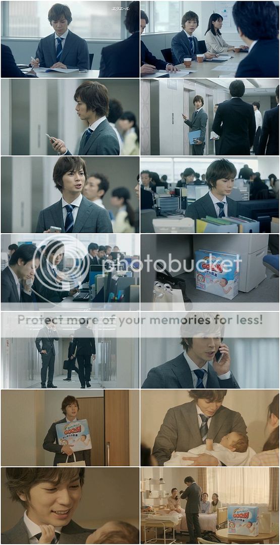 這隻新CM很有意思。是說潤是上班族,可是這天一直坐立難安,在等電話。其他同事還問他『今天還來上班?』終於等到電話了,趕出去接電話。CM忽然拍到潤桌子底下的GOON紙尿片。我就在想……難道是說潤的老婆(CM裡的)要生了?潤趕到醫院時,那個女生忽然喚他為“哥哥”我不知覺噴笑了。