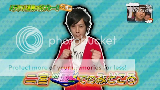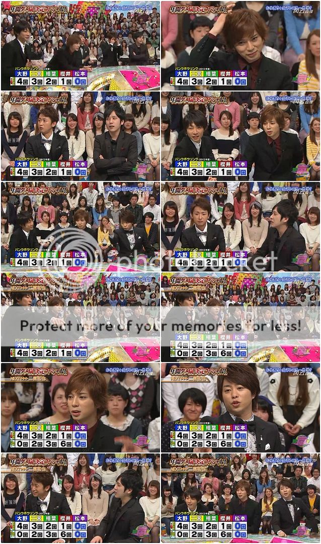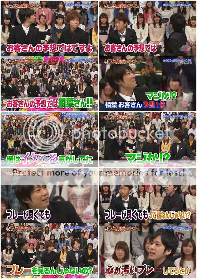 整段的高潮就是我們完全不知道的幕後花絮啊!!話說每次不是都會出現門把各種POSE嘛?就是那個在進行遊戲前,讓電視機前的觀眾可以拿起遙控來預測結果的那段。其實是門把各自分開錄製的。在staff桑心裡留下好印象是因為NINO每次拍攝完都會和staff桑鞠躬道謝。好有禮貌的孩子啊!!!潤爺吐槽『這是你謀策了整年的事吧。』哈哈哈!就為了MMDA會播出?哈哈哈
