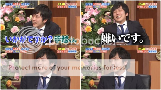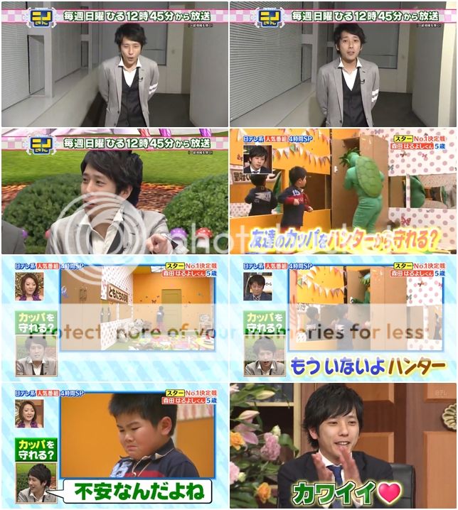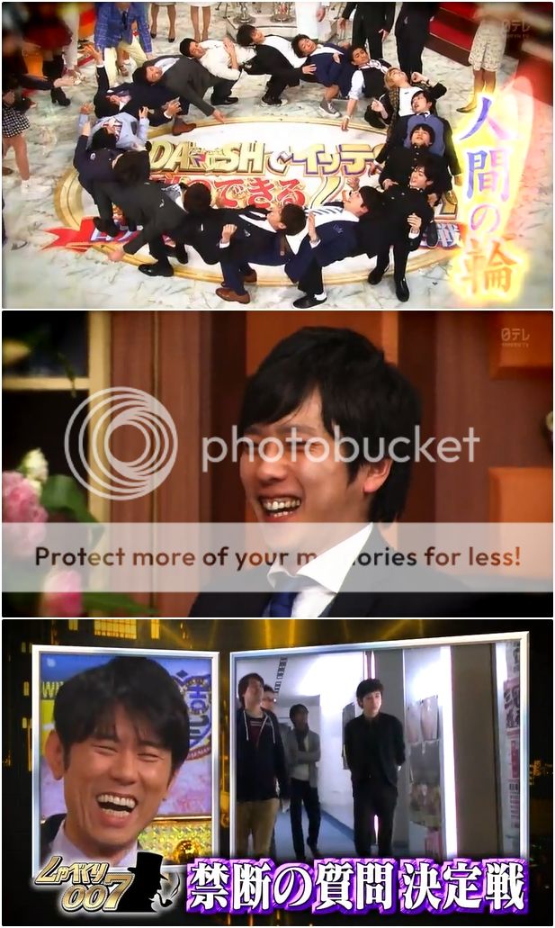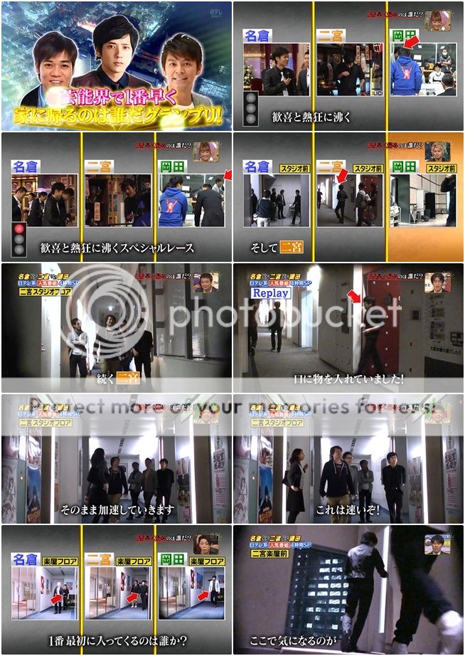 最後真的好無聊!!三位MC被007的米娜猜測誰會是最快一結束拍攝就離開攝影棚、最快來到電梯口(準備回樂屋)、最快回到樂屋、最快離開電視台。真是有夠無聊!不過NINO那段很可愛,是說他一結束拍攝離開攝影棚就開始在吃東西。卡哇伊!然後也是最快走到電梯口的。回到樂屋,可惜了,J家要求不能拍攝NINO的樂屋。啊啊!!!不能看到NINO的胖次!!哈哈!因為其他兩位MC回到樂屋第一件事就是換衣服。只能在NINO樂屋外聽他和manager桑的對話。還在為劇番宣呢!你根本是懂有人在跟拍吧!