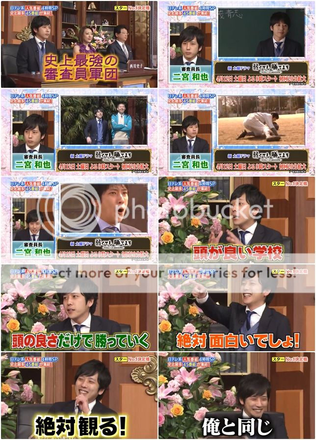 最後讓三位審查員來決定出最好的冠軍番組。最後選出了手越君的番組!NINO也是選擇手越君的番組的。現場MC『二宮桑不是嫌討厭嗎?』NINO『其實也不那麼討厭嘛。』(哈哈!J家的後輩嘛。習慣了要被前輩吐槽一下的。就是自家人才能開玩笑的。)