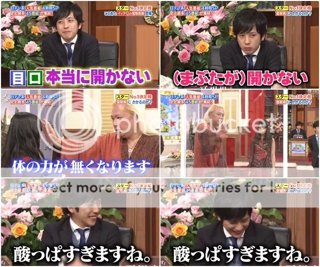 話說,其中一個冠軍番是做了催眠的示範。現場米娜都不相信是真的,手越君還懷疑自己的番組夥伴。哈哈!沒想到番組就把催眠大師請到現場來了。大師請了AKB的女生來做示範。天啊!!我有點不敢相信但是又真的太逼真了啊。催眠師催眠了AKB的女生說讓他無法控制的走近那塊板子,然後貼緊那個板子。在催眠師沒解除催眠前,女生是無論如何再怎麼強行推開也無法自己離開那塊板子的。太可怕了!!