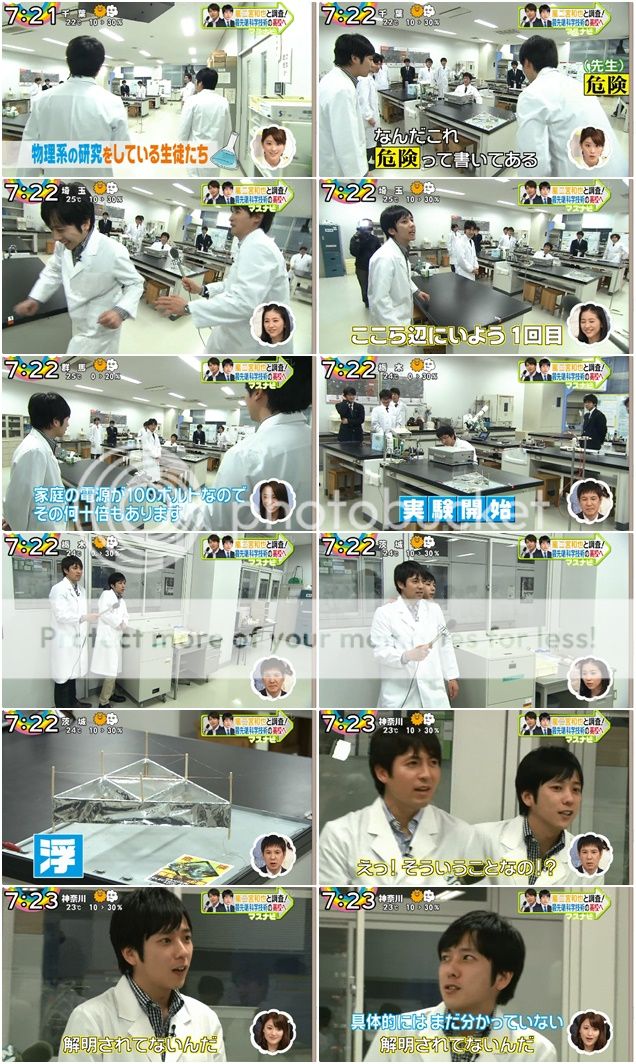 最後到了物理系的研究室。一進到實驗室,學生們看NINO和MASU桑靠近就告訴他們那個東西很危險。看看我們NINO閃的多快啊!哈哈!不過身為我們家的愛豆,你當然要閃!要是有什麼損傷我們會心疼的。不過NINO你好壞啊!直接躲在MASU桑身後,用他來做你的擋箭牌是怎樣。哈哈!不過這個實驗好可怕的厲害!為什麼會漂浮起來啊????