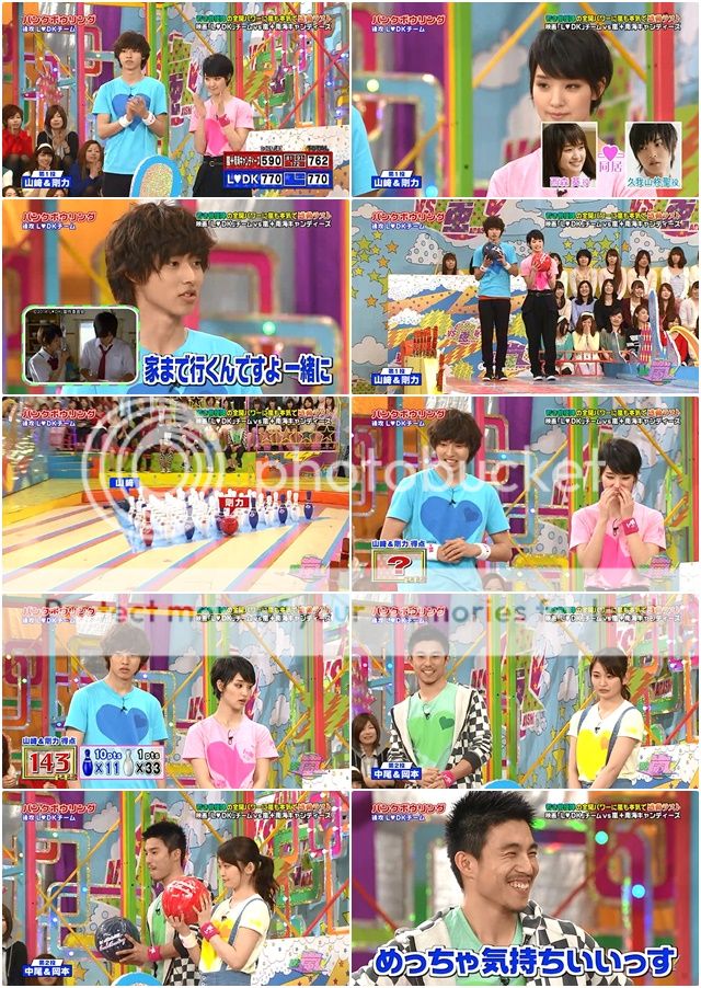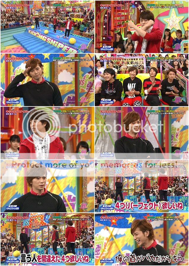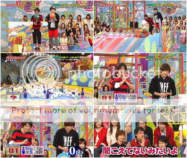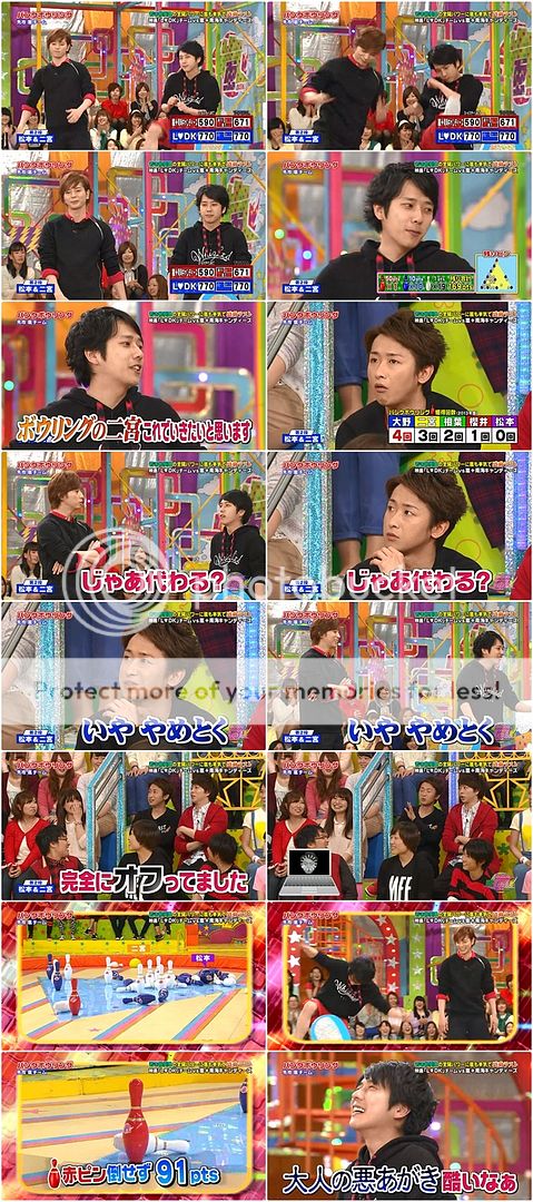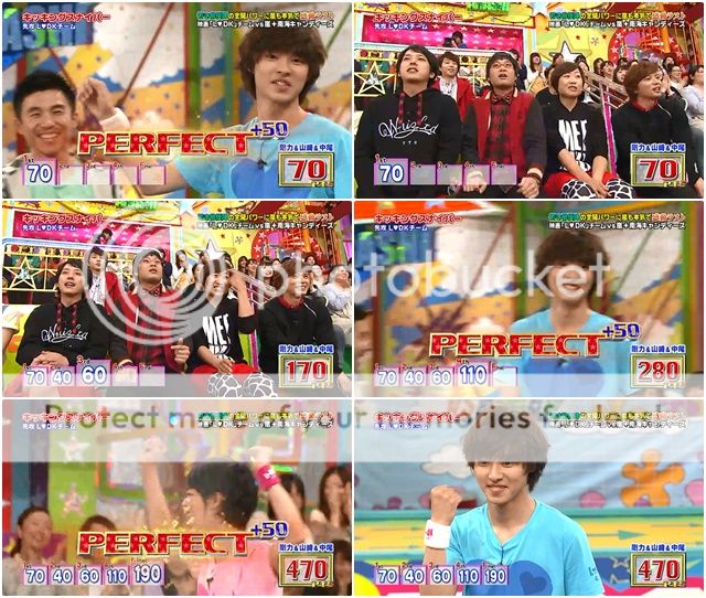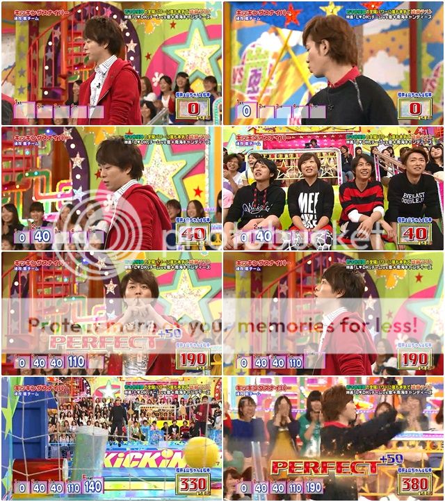 好笑的是,有些得意的阿翔第五輪踢出的球很大力的撞到了後面的板子彈起來直接飛到板子後。阿翔驚訝轉身看著台下的staff桑。山里桑不錯,踢倒了多數的筒子,留下一個筒子。這次潤爺看得出有稍微特別瞄準,於是……PERFECT!!完美啊這球!最後嵐隊得分380分。並沒有輸很多。還好也有兩個PERFECT了。