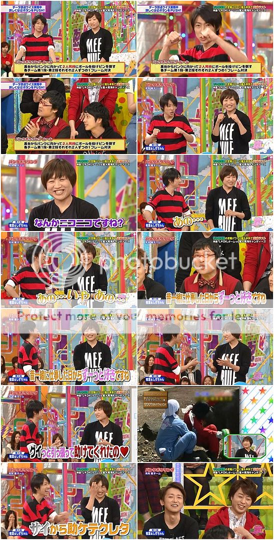 嵐隊首先派出的是雅紀和sizu醬。雅紀幹勁十足呢!伊藤桑問sizu醬感覺如何?有小鹿亂撞的感覺吧?怎麼回事?於是伊藤桑問山里桑原因。山里桑說其實sizu醬之前和雅紀一起工作後就一直很喜歡雅紀呢!KYA~~~~雅紀忽然想起來是動物園。sizu醬自己害羞的解釋其實那時他們出外景,sizu醬因為很緊張,沒抓緊,從犀牛身上掉下來,當時雅紀快速的從後頭扶住了sizu醬。果然亞撒西啦我們雅紀baby!!!阿翔,你有沒有很得意呢?大家都好喜歡你家雅紀呢。