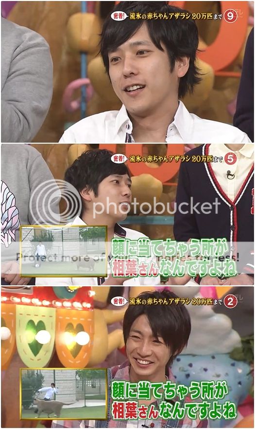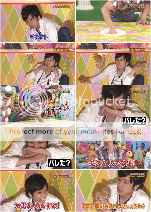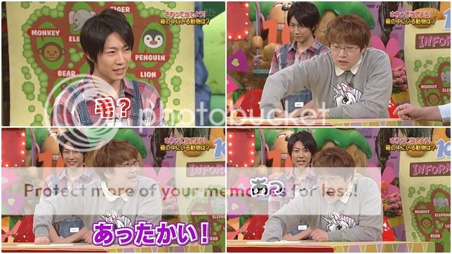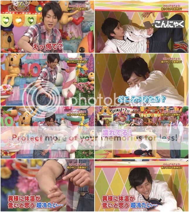 NINO一直作弄雅紀,還害雅紀一緊張撞到某部位。哈哈哈!他就一直摀住嘴忍耐住笑。NINO手上拿的是……芋頭之類的嗎?(原來是蒟蒻啊!)雅紀說箱子裡的東西異常低體溫,而且還是濕濕的。哈哈!!!這段真的是單單看雅紀徬徨的樣子,NINO頑皮的樣子就很開心了!!