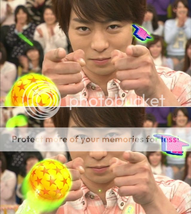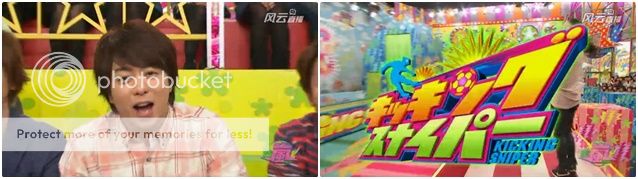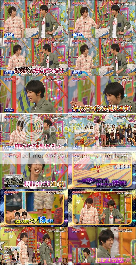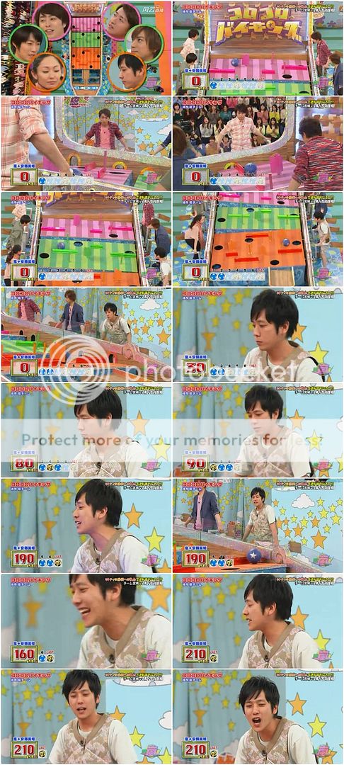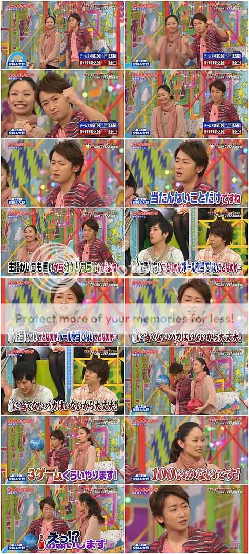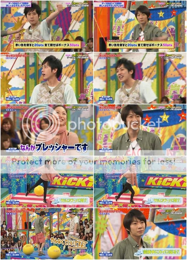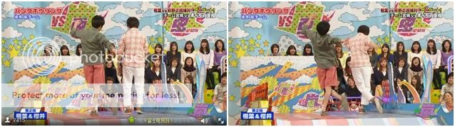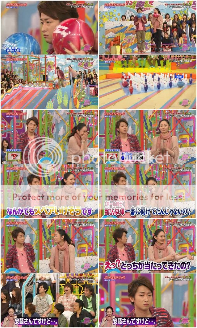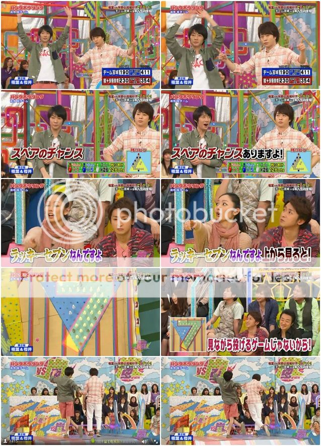 第二投終於給我盼到些期待。是我們櫻葉啊!!今天雅紀果然很強勢!安滕桑就說紅色瓶子交給台上的櫻葉了因為現在剩下的瓶子剛好形成了LUCKY 7。看下面截圖就能理解了,真的剩下的瓶子隊形是7的字樣。於是我們櫻葉夫婦就開始在台上胡鬧了。噗!難道是要我們這樣投?兩人就開始做往後投的動作。真是很愛胡鬧的兩夫婦!不是這個意思啦!是要你們拿出真本事來!