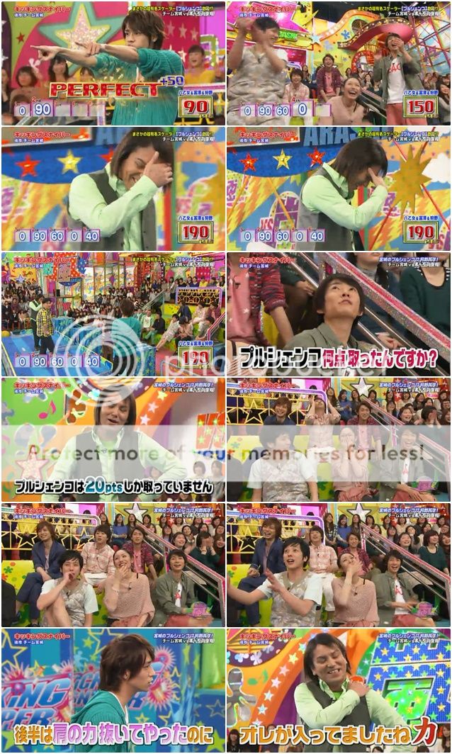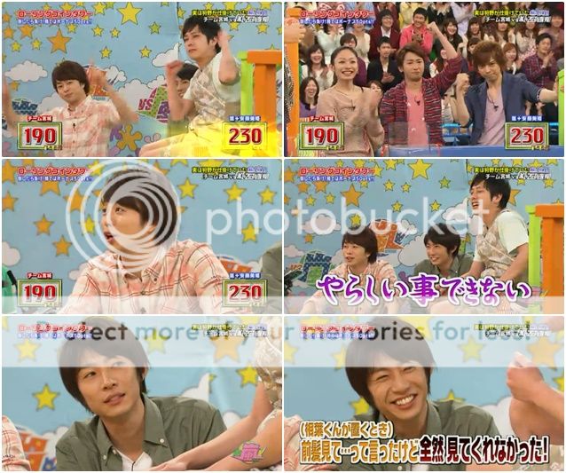 開始遊戲了!!八乙女君好厲害的拿下第一個PERFECT!!真的給知念君雪恥了!不愧是J 家的!最後狩野桑就只拿到了20分。所以雅紀很得意吧!!今天兩人對決,到現在為止是打平吧?