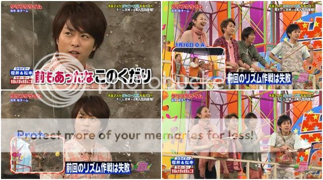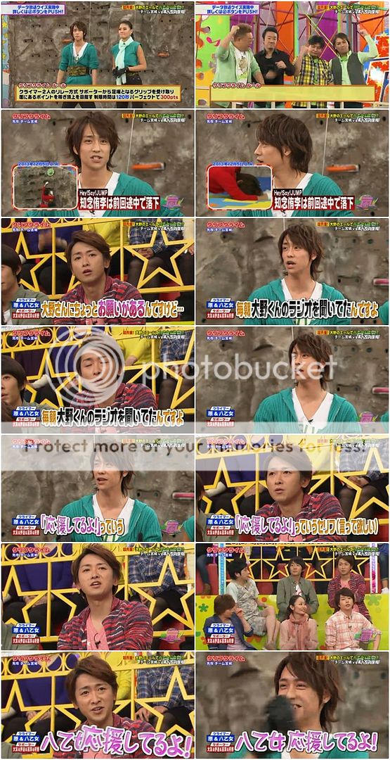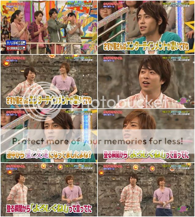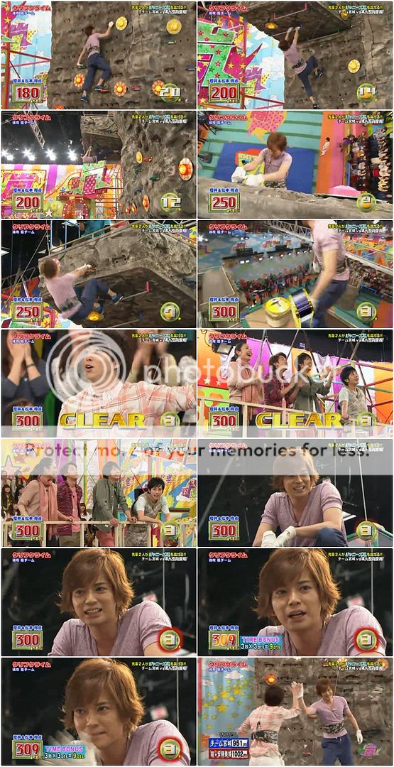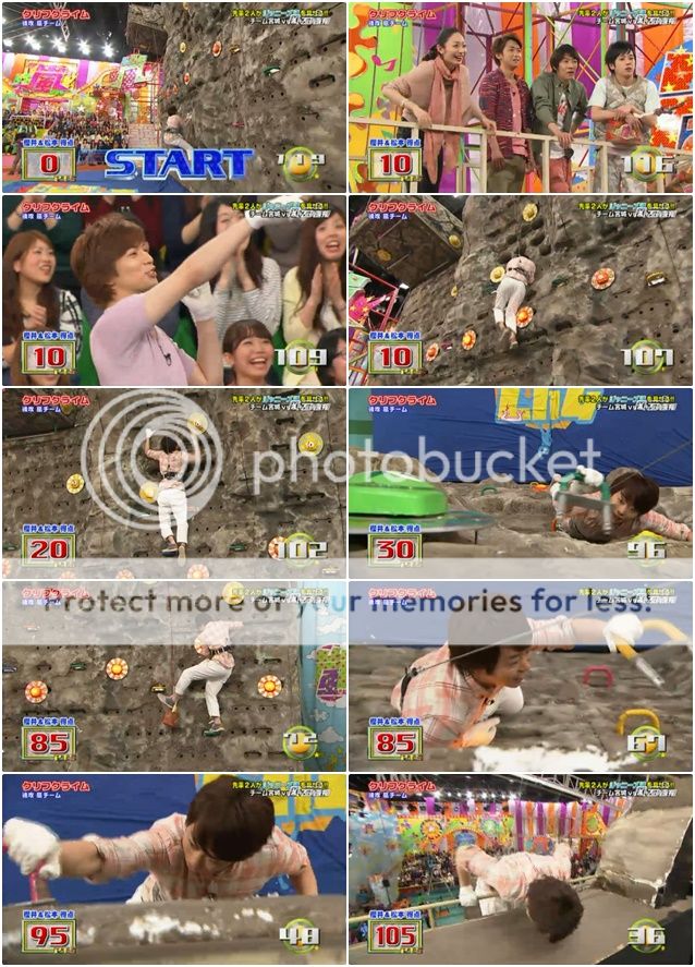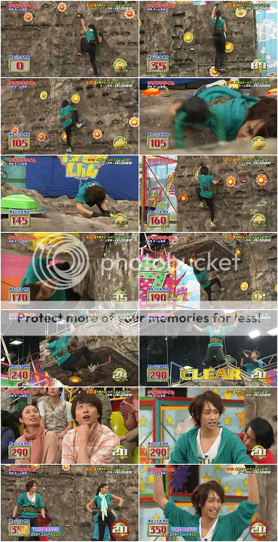 整段攀岩我真的覺得阿翔真的好……驚險。好幾次差點掉下來不說,安藤桑也是來胡鬧的嗎?阿翔都沒轉身要把手,安藤桑就把把手甩出去了,不過難得我們阿翔身手敏捷的用腳勾住了把手才不至於浪費了把手。但是我說阿翔啊!!你快一點啦!!時間剩下不多了!!我們潤爺還要挑戰台場下巴的耶!!