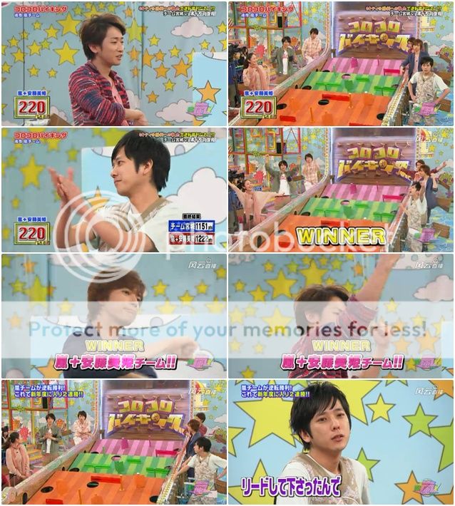 嵐加油!!說真的,我真的覺的NINO今晚好給力!!安藤桑和NINO感覺默契很不好,NINO好幾次要很大力的拉回那個把手才可以把球控制住。都是我們NINO撐住的說!!而且指示也給的很好!!最後得分220!!!!