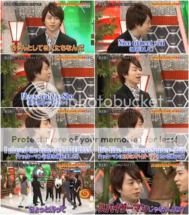 翔『Nice to meet you. My name is Sho Sakurai. Please call me Sho. I played the role of YATTERMAN. It's like Japanese Spiderman』(翻譯:很開心見到你。我是櫻井翔。請叫我翔。我飾演Yatterman的角色。它就像是日本的蜘蛛俠。) 看到這裡我都直接噴笑了。