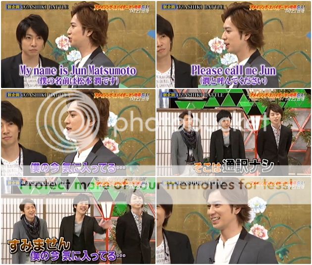 潤『My name is Jun Matsumoto. Please call me Jun.』然後……為何這句大家都聽的懂了呢?我一聽到那個『僕……』我就開始笑了。潤還希望三位嘉賓一起做出那個口號。最近潤都喜歡玩這樣的梗呢。