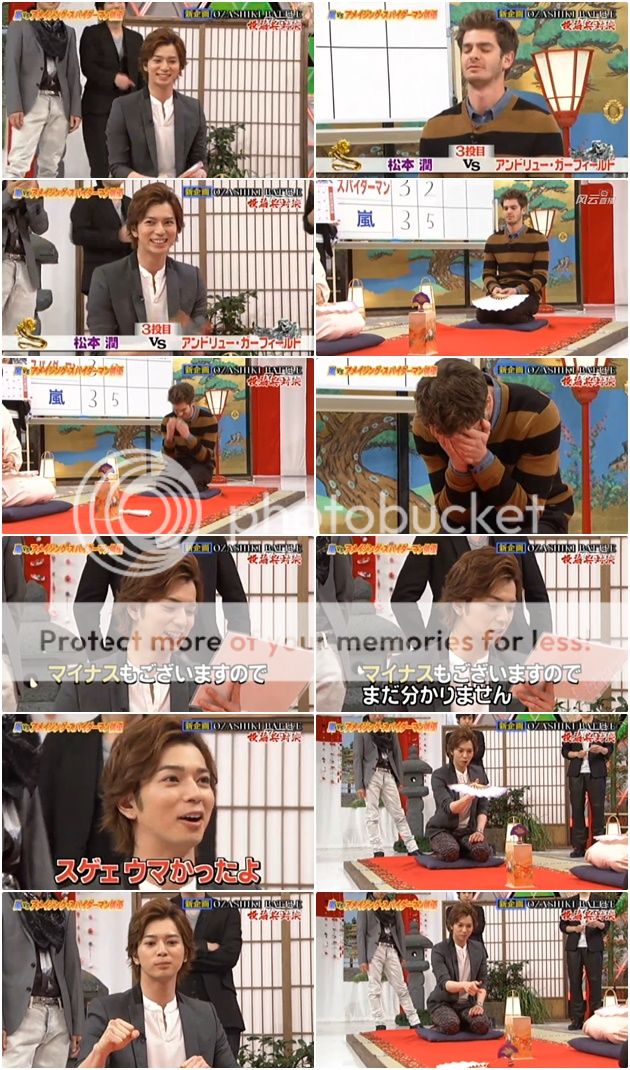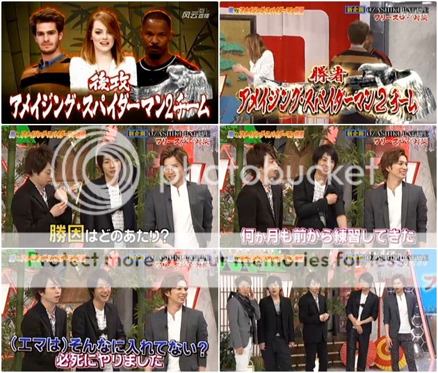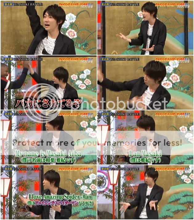 雅紀『My name is Masaki Aiba. I am Masaki.』(NINO就吐槽『說兩次了。』) 雅紀繼續『I like... no... I love Amazing Spider man.』然後就做出蜘蛛俠的動作。噗!!!你也是個會收買人心的人啊雅紀!!