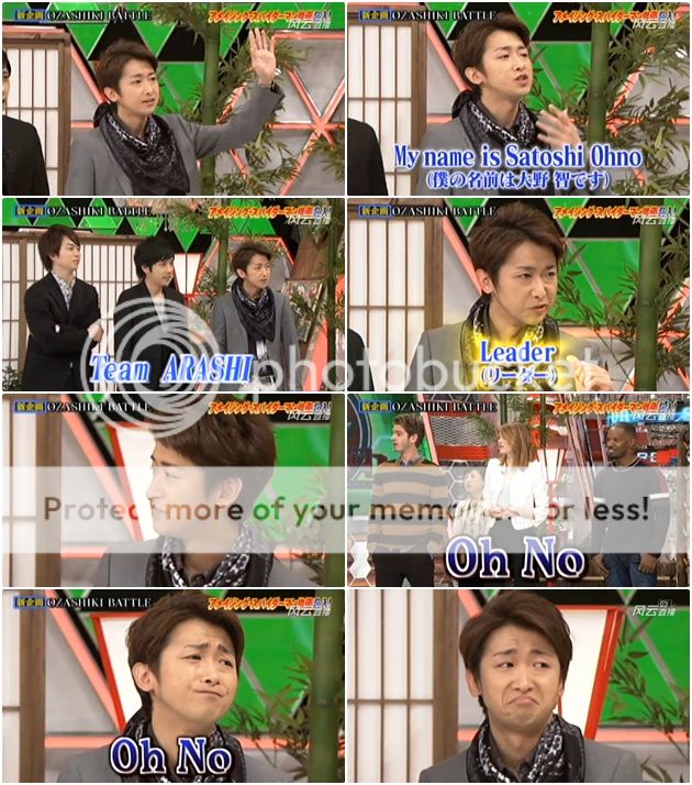 利達先HI!自我介紹『My name is Satoshi Ohno. Team Arashi. Leader.』(我想不用翻譯吧。噗!)那得意的臉啊!!知道你是利達啦!阿翔好故意『His name is OHNO, O.H.N.O.』所以嘉賓就跟著說『OH...NO....』哈哈哈!!利達表情秒殺!!!大概被很多人玩過這個梗了,已經習慣了吧。