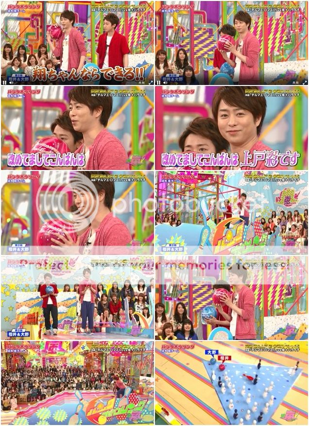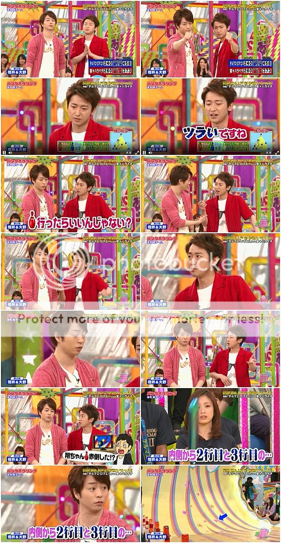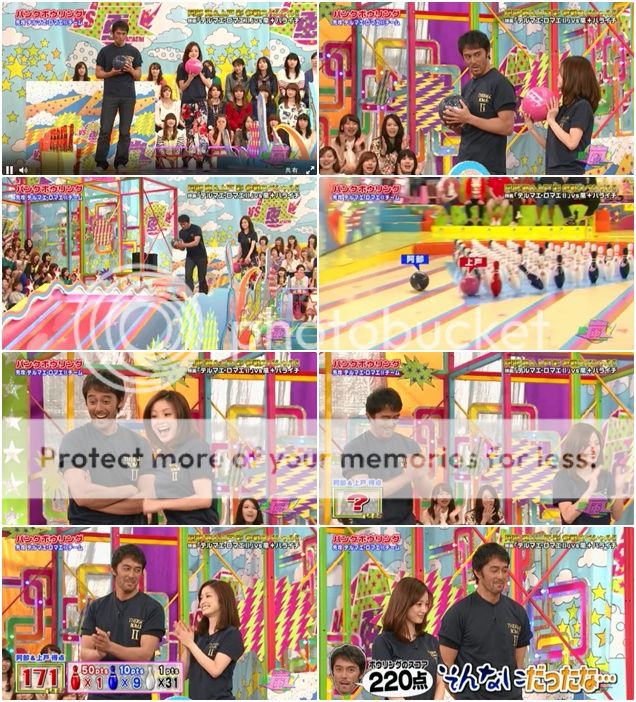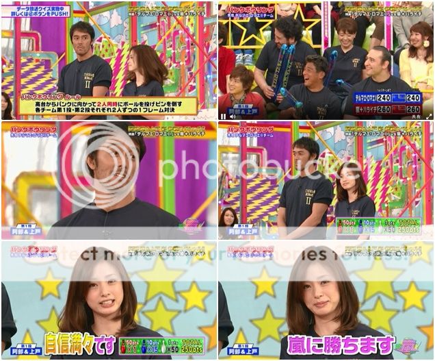 投球吧!雅紀先給澤部桑一點建議。然後投出去!基本上……雅紀的球一個瓶子也沒碰到。哈哈!澤部桑的球澤是直接和紅色瓶子擦肩而過了。潤爺就問『發生什麼事?發生什麼事?』說的當時是雅紀。