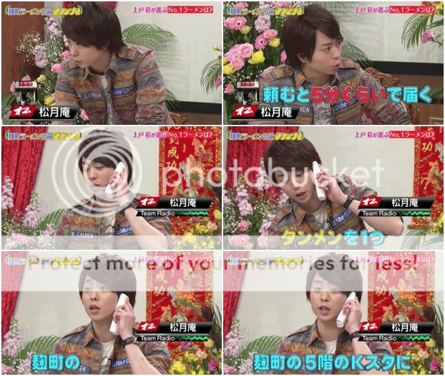 今天staff桑為番組準備了電視台附近的拉麵店的菜單。要門把來撥打電話去訂購他們想吃的拉麵,看是哪家拉麵店外送最快,還有最後讓彩醬決定哪個拉麵最好吃。