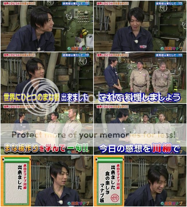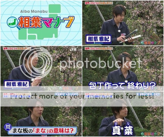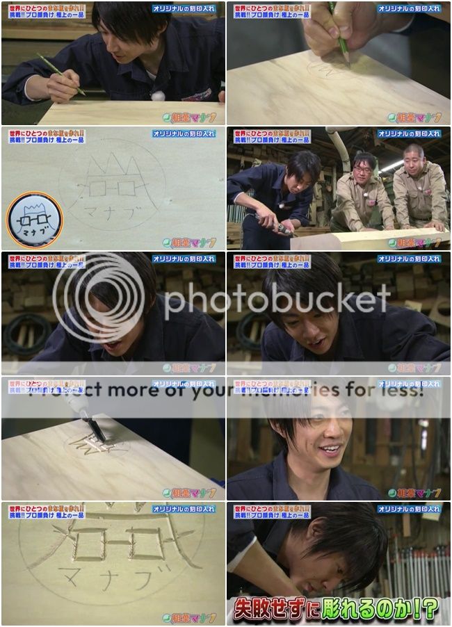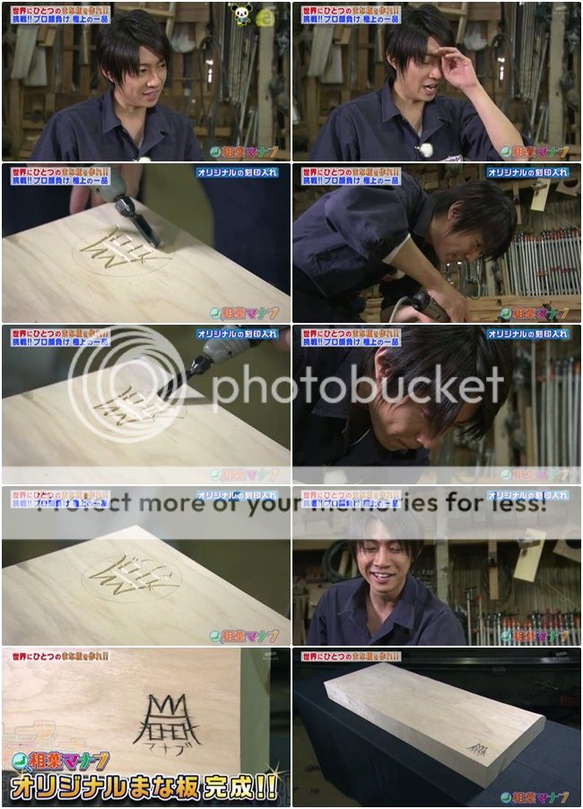 雅紀手好巧啊!!!順利的雕刻出那三個字!!《相葉マナブ》的切菜板完成!!雅紀說接下來可以用這個板在番組裡做料理了。好可愛的logo呀!完全相葉雅紀著作喲!
