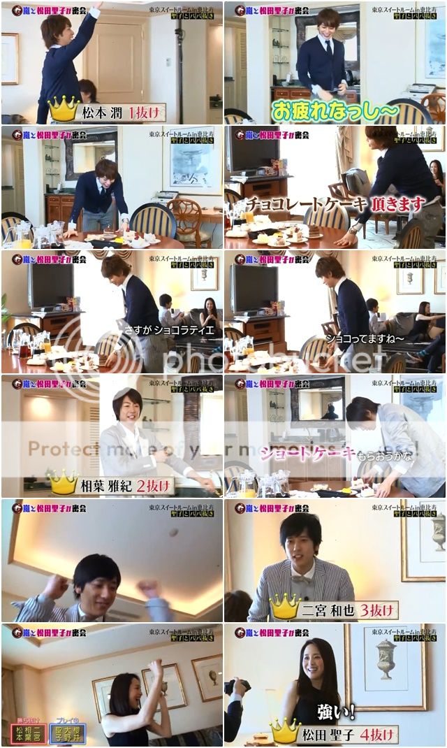 最後第一位勝出是潤。選了巧克力的蛋糕。果然是巧克力職人代表啊!第二是雅紀,雅紀選了草莓shortcake。之後就是NINO,然後到聖子桑。我發現這裡門把都好溫柔啊!!即使聖子桑是第四位勝出但是大家還是把蛋糕都拿出來給聖子桑來選她喜歡吃的。太亞撒西了這群男人。