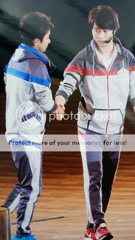 阿翔站上講台,台下NINO坐了翔的位置,所以現在順序是黃 - 綠 - 紫 - 藍。阿翔先來打招呼,和門把說『こんにちわ(下午好)』然後也很現場全部嵐飯說『こんにちわ』還有『お元気ですか(心情還好嗎?)』當然我們全部都是回复『元気です!』(看到你們哪有心情不好的?哈哈哈)向上海的米娜用中文說『大家好。開心嗎?』(中文很標準呢)畫面裡的上海飯好給力,門把全部驚呼。然後對新加坡說『Are you having fun?OK LAH!』(夠了!已經變成新加坡代表名詞了。哈哈哈)不過新加坡飯也好給力!!歡呼超級大聲的!但是因為錄像還是會稍微有點delay,不知道嵐會不會覺得我們很冷淡呢?因為來不及給他們看到我們歡呼的動作。