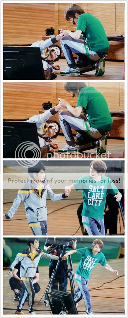 輪到潤示範,潤要求利達來示範。兩位從樓梯走下去,然後利達準備要走上台階了,迅速的走在前方,潤在後面追的很辛苦於是很嬌羞的對利達說『等等我啊。』然後牽起利達的手(哇!!!!潤智的暴走了沒?我已經暴走了!)
