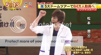 第二個是潤。潤說小時候很喜歡大棒球所以想成為棒球選手,成為某個非常厲害的棒球選手的代替者。如果沒有潤(相片少了潤),那就沒有所謂的MOVING STAGE了!因為潤是嵐的IDEA MAN!鏡頭拍到潤,潤也是擺出了超意外非常可愛的手勢。(那絕對不是潤!其實呢……弟弟還是有弟弟的一面的。被稱讚會開心呢。)