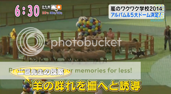 開始請門把趕羊前,NINO先生先來放VTR,關於兩隻狗在農場裡負責把羊趕進羊欄裡的畫面。超級厲害的啊兩隻狗先生,合作的超級好,一隻負責趕一隻負責圍住,因為羊看到它自然不敢接近,就會乖乖的進了羊欄裡!這也是為何現場的羊現在是放生中的。因為NINO先生要請門把來合作把現場的羊小姐先生們在限時3分鐘裡趕進欄裡。潤討價還價『可以三分半鐘嗎?如果可以4分鐘那更好。』(笑的像天使)這時候雅紀『不,三分鐘可以喲。』(明明潤已經討價成功,卻被雅紀破壞了!哈哈哈)阿翔要求NINO適時的來給指示,因為既然是要嵐合作當然要包括先生在內。雅紀就拼命幫腔,果然是夫唱婦隨啊~ 潤讓NINO自己抓時間點來給指示。雅紀就一直和NINO提議時間點這裡雅紀超級可愛的!