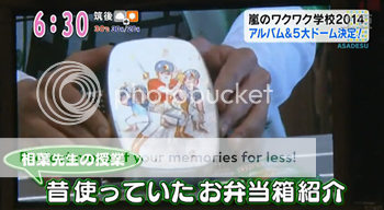 門把的便當時間是NINO抽到了雅紀媽媽準備的便當(雅紀隨意讓NINO抽)。於是雅紀把便當拿出來,便當盒是以下這個樣式。上面是一些super hero打棒球吧?(完全沒看過)。潤問這個便當盒用了多久?雅紀說這個便當盒用了30年啊……翻過來看後面有些了あいばかつひさ這幾個字。打開便當盒,有雅紀最愛的KARAGE(炸雞)!也有蛋餅,香腸和小番茄。NINO說相葉媽媽有準備了信。於是NINO來閱讀信的內容。我大概是記得這些……『首先,雅紀很喜歡炸雞呢。(雅紀說很喜歡!)雅紀不喜歡吃番茄每次把番茄放在旁邊。(雅紀現在已經能吃了)』NINO說還有另個相葉媽媽準備的便當是給雅紀成長期吃的,打開上層是撒拉,下層是用蕎麥面做的意大利面,混合海鮮一起煮。於是請門把也來試試看媽媽準備的面。(我說櫻井翔!你在電視上啊!請不要一次夾那麼多面啦!我看便當裡一半都被阿翔吃掉了。看看我們利達都拿這麼少。)