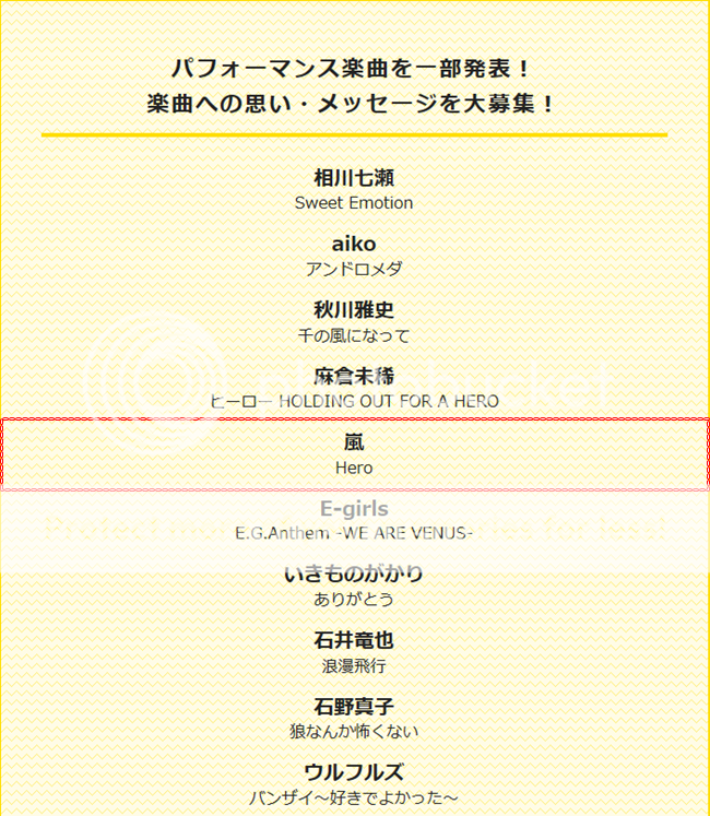 昨天在FB上我也先分享了今年嵐會演唱的歌曲。好難得的!今年選擇了『HERO』。記得上一次聽是去年24時間呢。依照往年的表演程序,我相信嵐不會只有一首歌曲的表演機會。記得去年還有全民一起來玩音符遊戲啊!今年怎麼可能那麼單調?除了個別單元外,期待其他的SP表演!待番組節目表出來,我會來分享的!