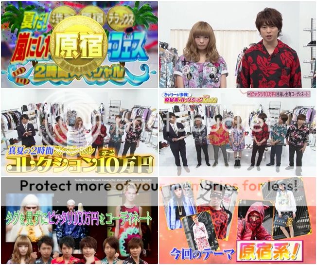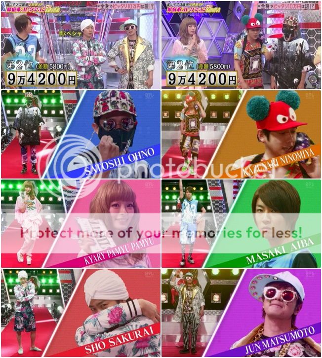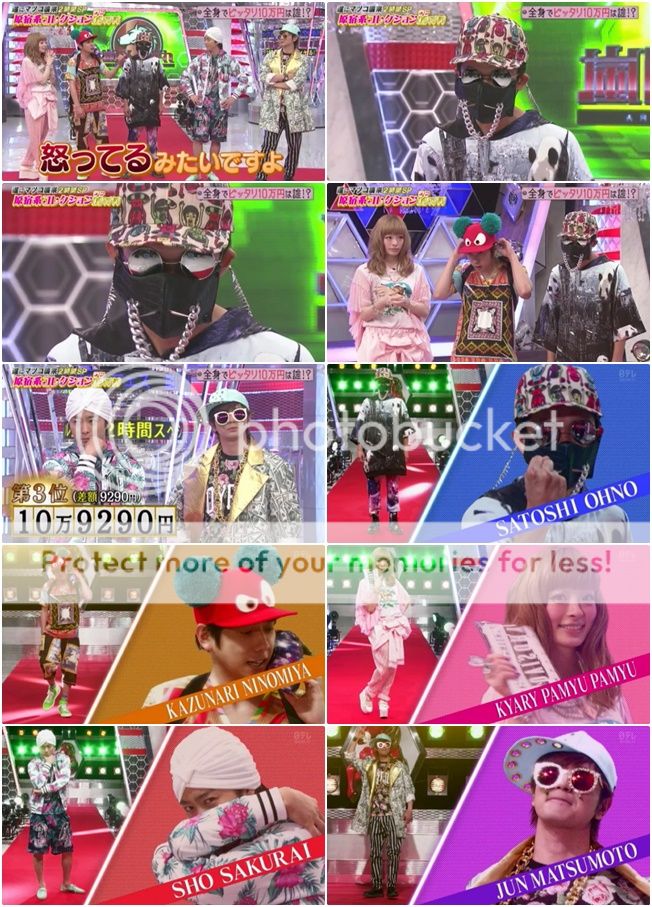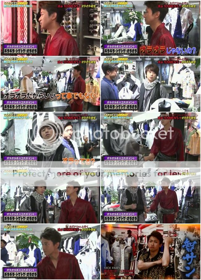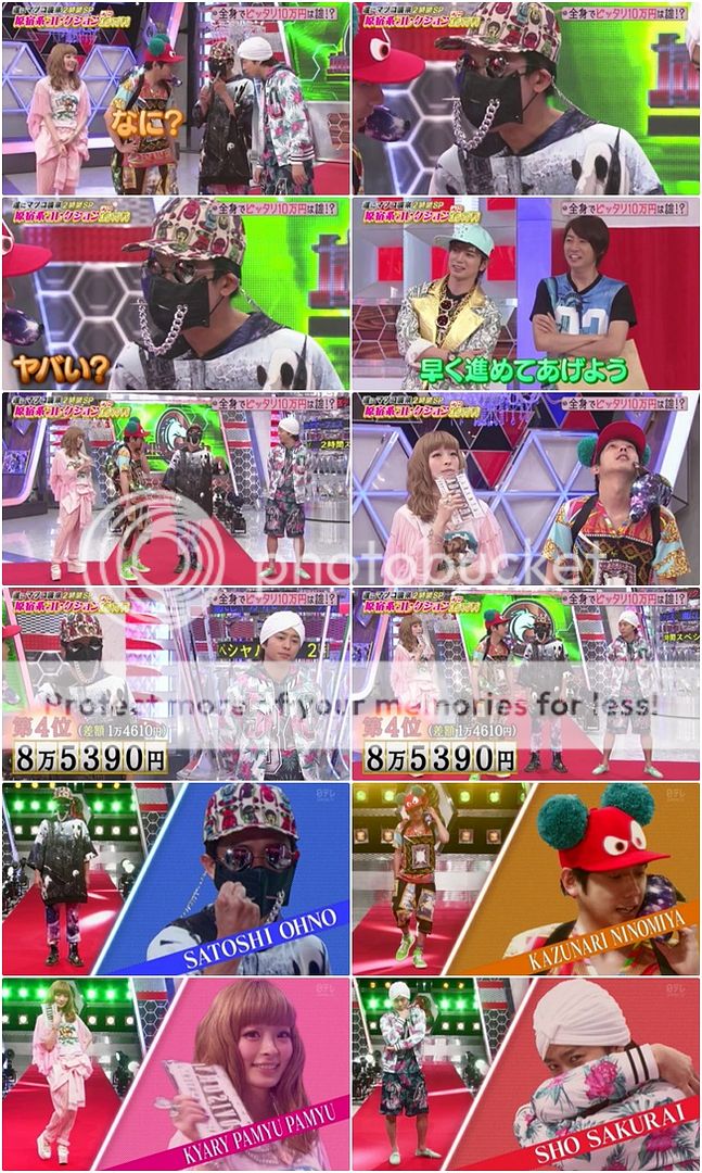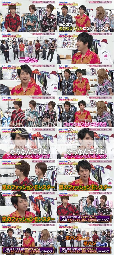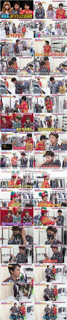 潤說對原宿一竅不通還一直問攝影棚內的KYARY醬意見,難道原宿就是要那麼奇特嗎?阿翔很快就選好了。MASU桑就問了一下『櫻井桑決定好了嗎?』翔『是KING。』哈哈哈!你很在意嘛你。上衣和褲子都是花樣式?這樣好嗎翔?雅紀也迅速的把選好的衣服擺到阿翔旁邊。那個自由女神像出現了!!緊身褲上的樣式是東京街道。雅紀這次要走紐約日本混搭風。哈哈!