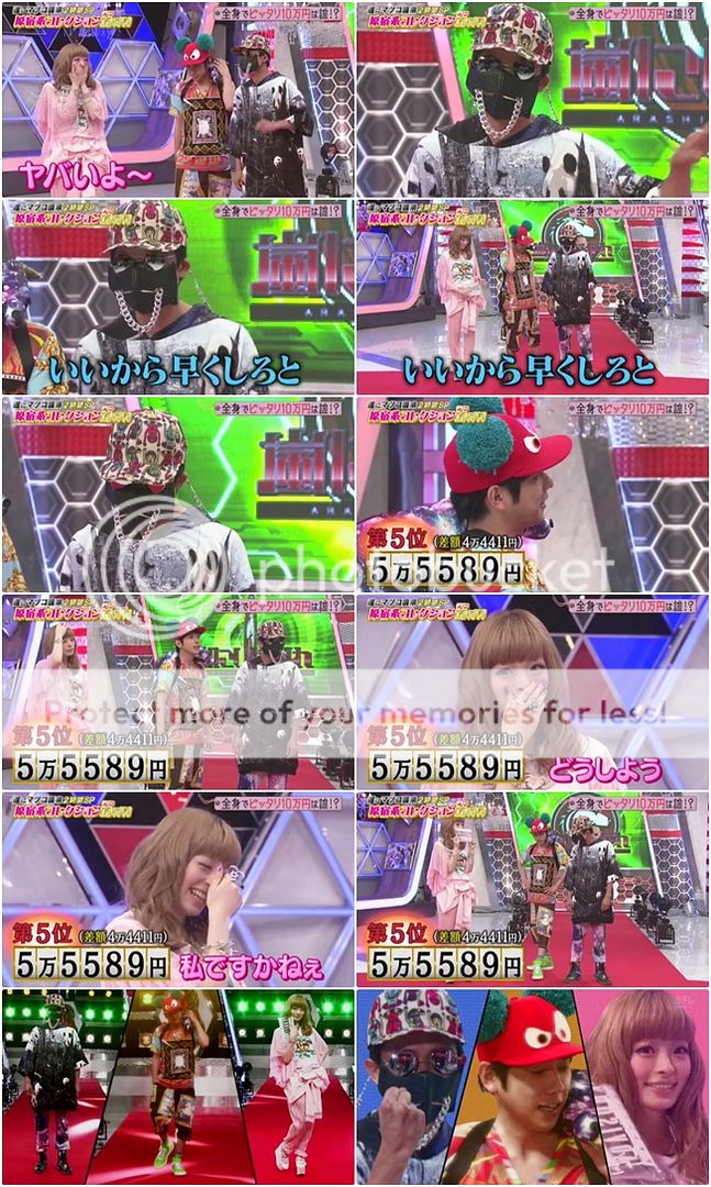NINO開始挑起帽子,拿起那個超級可愛的帽子!!好想要啊!不過這個帽子NINO猜要2萬!番組沒有直接公佈答案,不過有說是天價了!!(天價啊……那肯定買不起了。哈哈哈!)話說我怕我後面會忘記提及,先說一下,NINO整段在揭曉成績誰是前5名時,一直在搓帽子上的那兩團毛耳朵。好可愛啊!!一定是觸感很好呢!!NINO立刻看到一樣東西,拿起來給利達。是那個口罩!原來口罩會出現是NINO導致的啊!利達摸一下那個口罩材質覺得很會貴呢。但是……一點也不貴呢。大宮很快就結束了挑選要去換衣服了。兩位都決定小小的賣關子不展示他們手上的服裝。利達『不要拍啊。』翔『你就在錄番組!』哈哈哈!利達,越認識你就越發現你就是個諧星。哈哈哈