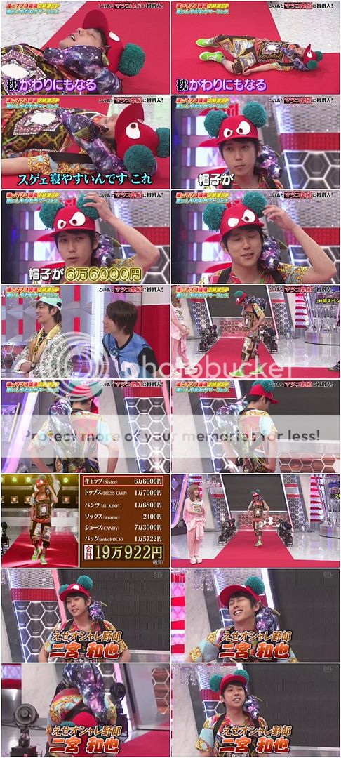 你別給我番組上直接太舒服睡著哦。潤『這樣枕的很舒服吧?』NINO『真的睡的超級舒服的!』哈哈哈!NINO不甘心的走到後頭一直來回走。有人不安了哦!因為今天要來展示丟臉服裝秀的就是NINO!嗯!帽子要6萬多還真是嚇死人啊!