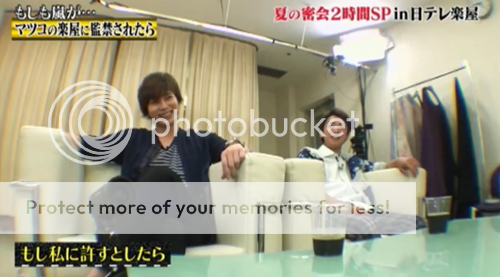 NINO卻故意說翔坐的有點遠。翔『我已經坐很靠近了。』但是還是依照小惡魔的意思坐靠近松子桑。更尷尬的表情了。翔和松子桑坐在一起就是很有大人的feel(所以前面都是小孩子?)是那種兩人說話會一直聊到過去的事的感覺。NINO小惡魔讓翔頭靠在松子桑的頭。哈哈哈!到底有什麼意義啊!NINO自己都噴笑出來,所以阿翔也就尷尬的笑出來了。