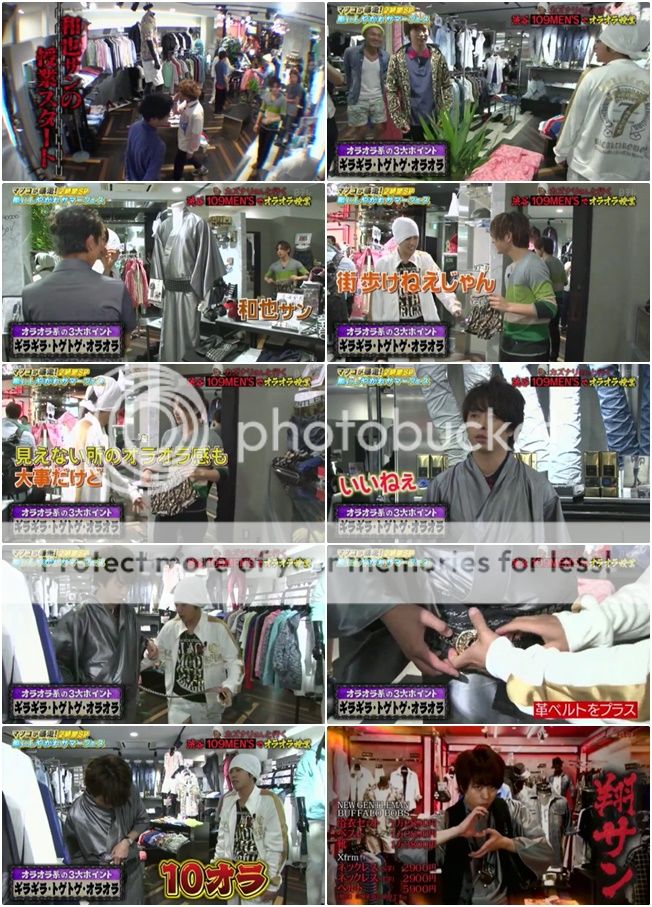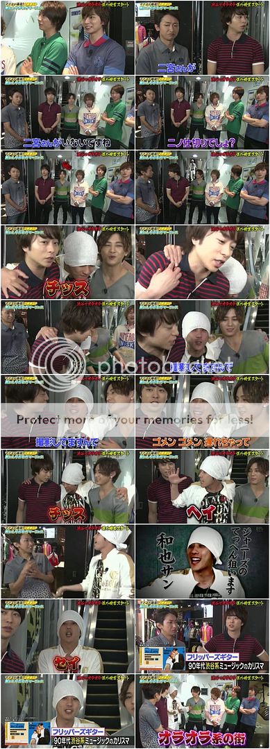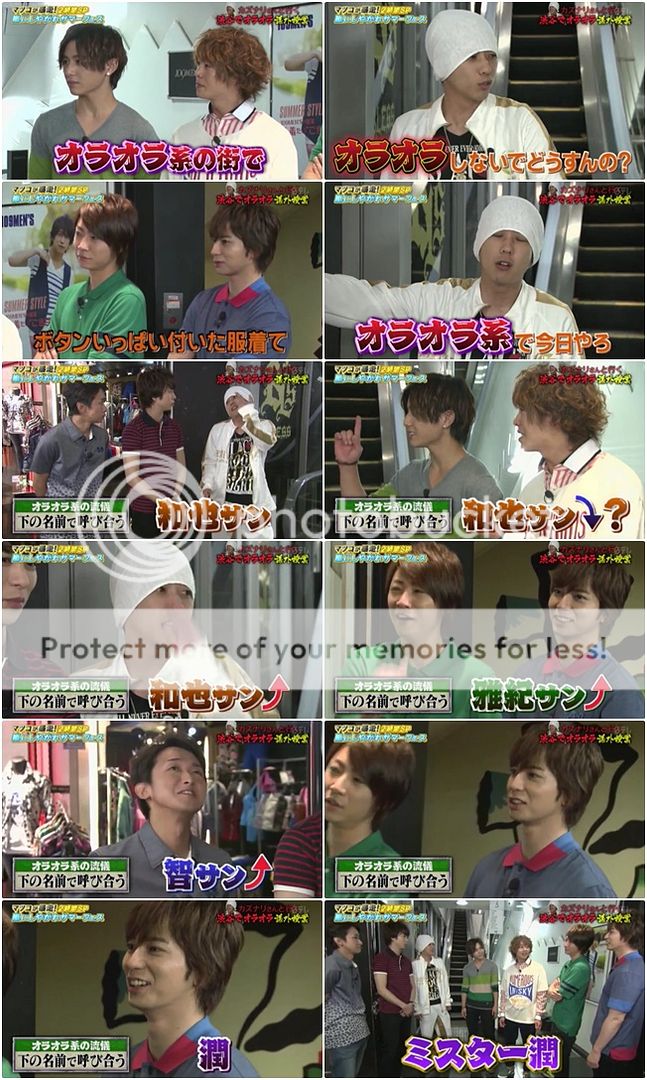 翔『誒?奇怪?二宮桑呢?』對啊!!開場怎麼沒看到NINO呢?忽然後頭的電扶梯,有個穿了一身HIP HOP勁裝的人下來了!!NINO變身今天的時尚達人了!!一出來就是整個靠在翔和山田君身上!NINO『來到澀谷當然就是“オレオレ”(本大爺)point咯!』還故意走到利達那裡去和他擊掌。