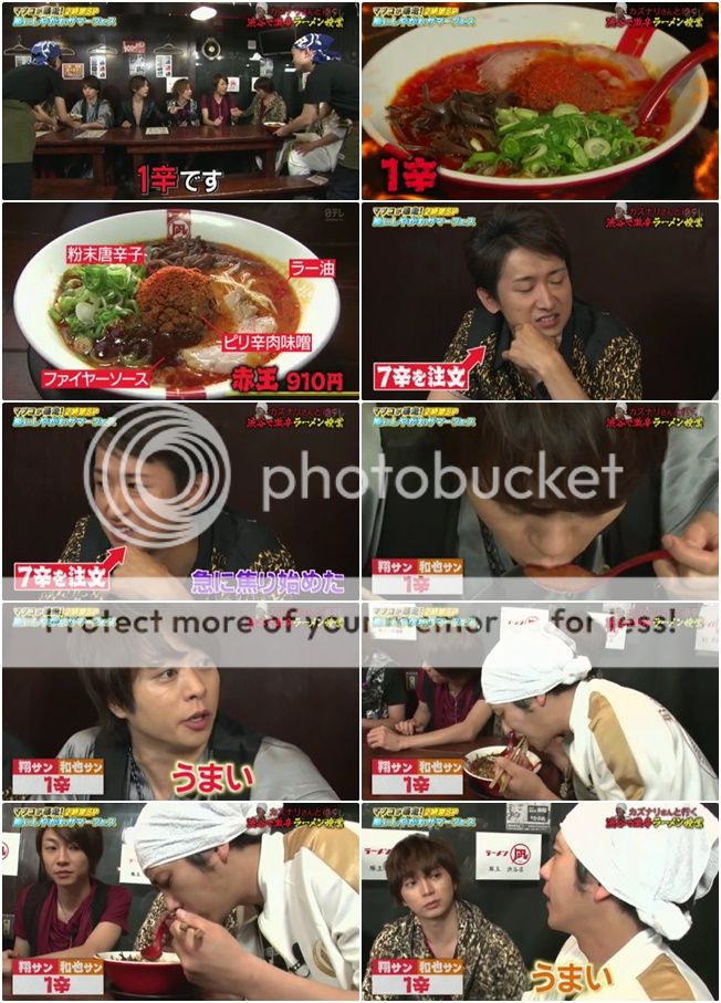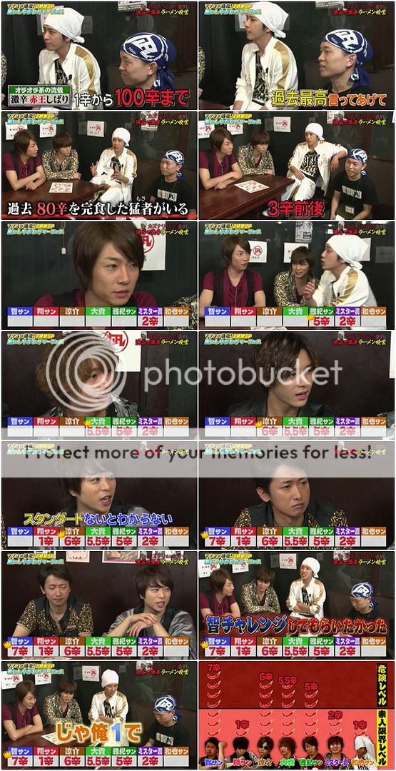 Mr潤選擇2級(原來Mr不吃辣啊),雅紀サン選擇5級、兩位HEY SAY選擇5.5和6級,問翔サン『一級就好。』哈哈哈!!阿翔真的不吃辣。而智サン呢?竟然選擇了7級啊!而和也サン呢?オレ一級就好。哈哈哈!!是的!寶貝腸胃不好不要勉強哦。