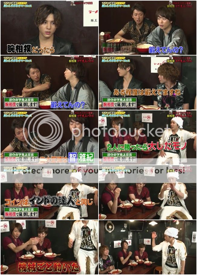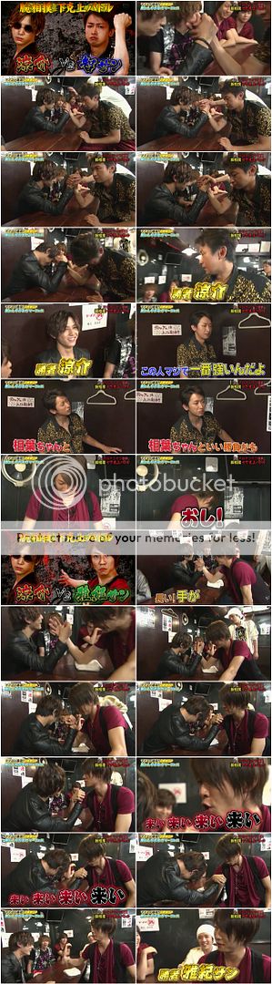 利達,你真的是大力士嗎?涼介君一下就掰倒你了。於是請出我們大魔王來和涼介君對決。很有氣勢呢我們魔王雅紀!涼介君說雅紀的手真長啊。哈哈哈!雅紀好得意!!!一直都在耍後輩嘛你!!一直在放水還一直讓涼介君繼續啊繼續啊。最後一個用力就掰倒了涼介君!!大力士啊雅紀!!你們最好別的最雅紀哦!!他會一下掰倒你們哦。哈哈哈!(尤其是對NINO說。)