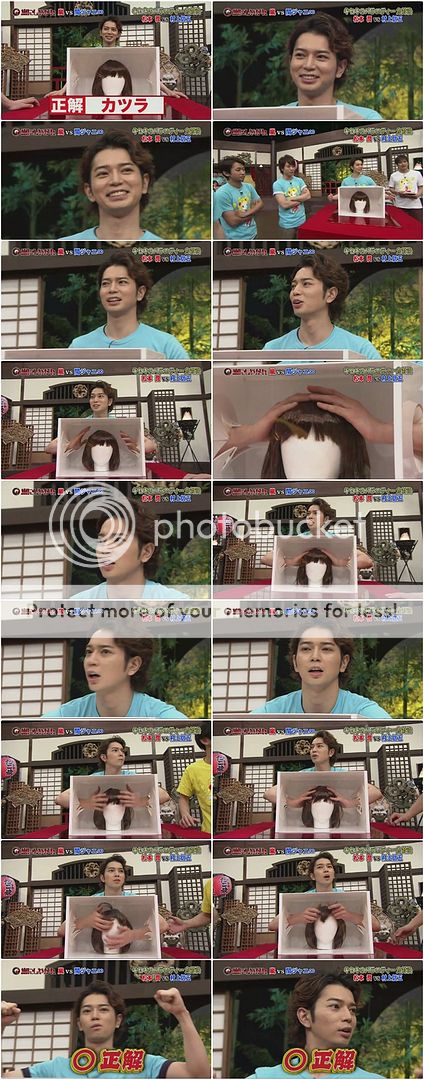 還好還好~~潤的恐怖箱子裡的是假髮。但是大家都被潤嚇到了,完全不害怕的雙手直接放進去的亂摸一通。但是潤一直猜不到是什麼,不過最後摸了一輪後還是答對了。