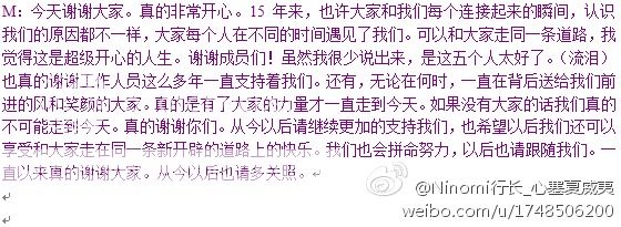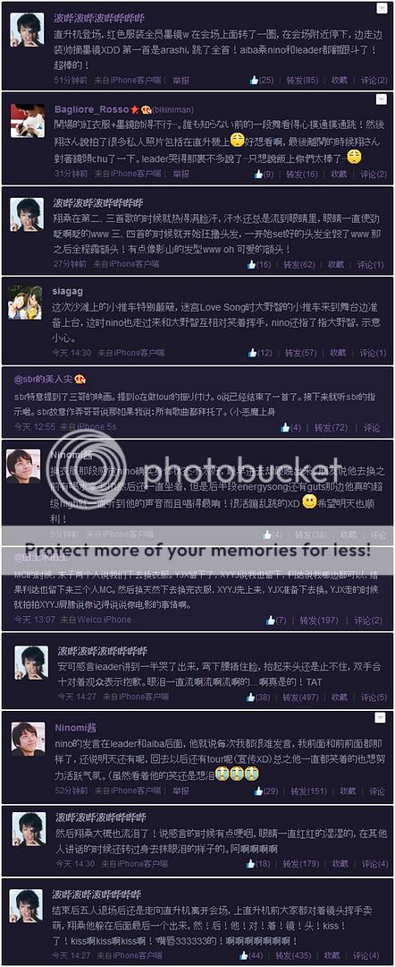 NINO 感謝詞是在利達和雅紀之後。話說NINO好像某首歌曲時動作太大稍微扭傷了腰!!我就說不要這麼拼啊!!!全部給我換上慢歌!!嗚啊~~~心疼的我好想哭 啊!!MC之後要下午換裝,末子要先下去換裝,當時NINO走的很慢。而且staff桑們一直遞水遞毛巾給他。NINO大概也有點中暑了所以臉一直紅通通 的。不過到最後message的時候,NINO開始恢復元氣了!!只能說……我太心疼太擔心了!!拜託了~~請五子一定要安全健康的回國啊!
