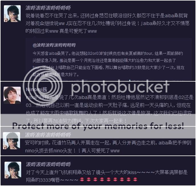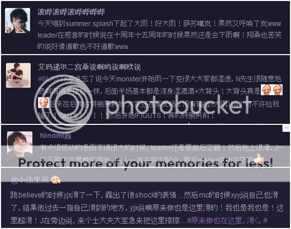 無論是嵐還是嵐飯,都辛苦了!!怎麼說呢……就有種果然只有嵐在一起的時候才能這樣呼風喚雨的!即使雨大的MIC開始不正常運作,五子還是堅持的唱完了全場。
