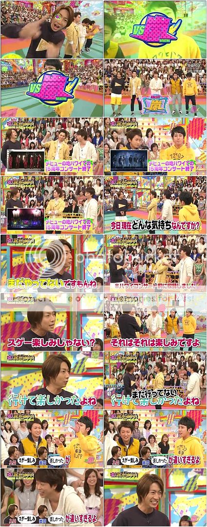 開場阿翔說現在夏威夷出道15週年控已經結束了。翔轉身問雅紀『現在感覺如何?雖然還沒表演。』雅紀『猶豫了一下要如何回答……。』因為這期番組收錄是在他們出發前往夏威夷前啊!雅紀『但是還是希望大家非常開心的看不是嗎?開始了好開心!』潤吐槽『還沒開始吧。』哈哈哈哈!!於是NINO吐槽雅紀前面說的話和結尾完全不吻合。哈哈哈!我們雅紀baby就是這麼天然可愛,沒辦法說謊的啦!翔,你也不用笑的那麼用力吧,才剛開場呢。